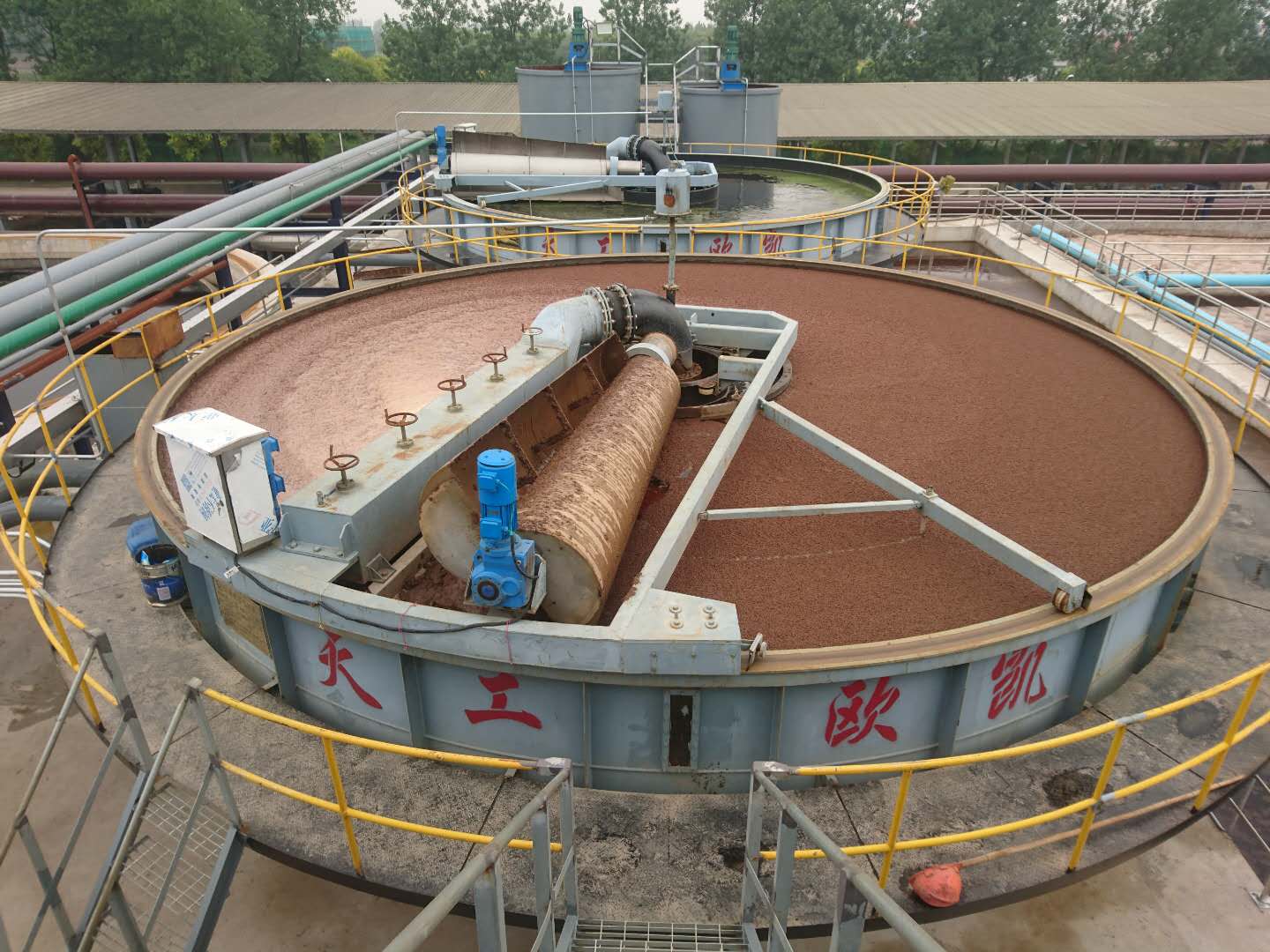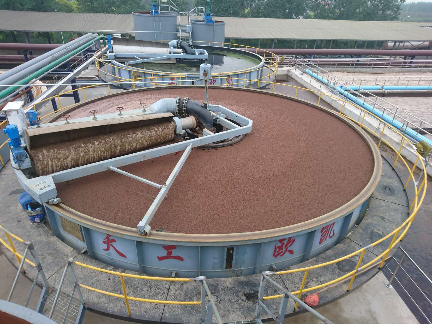 原水經(jīng)過提升泵至中心進(jìn)水管,同時溶氣水及藥液一起泵送至中心進(jìn)水管與之混合,再經(jīng)過布水管均勻布水到氣浮池內(nèi),撇渣機(jī)構(gòu)與主機(jī)驅(qū)動機(jī)構(gòu)同步移動,不存在死水區(qū),邊旋轉(zhuǎn)邊移動,從而將浮渣收集起來,通過中央泥管排出池外。池中的清水通過清水收集管從中央排走,該收集管也與主機(jī)驅(qū)動機(jī)構(gòu)同步移動,清水管與布水管被布水機(jī)構(gòu)隔開,彼此互不干擾。池底的沉積物被刮入泥斗中,定期排放。