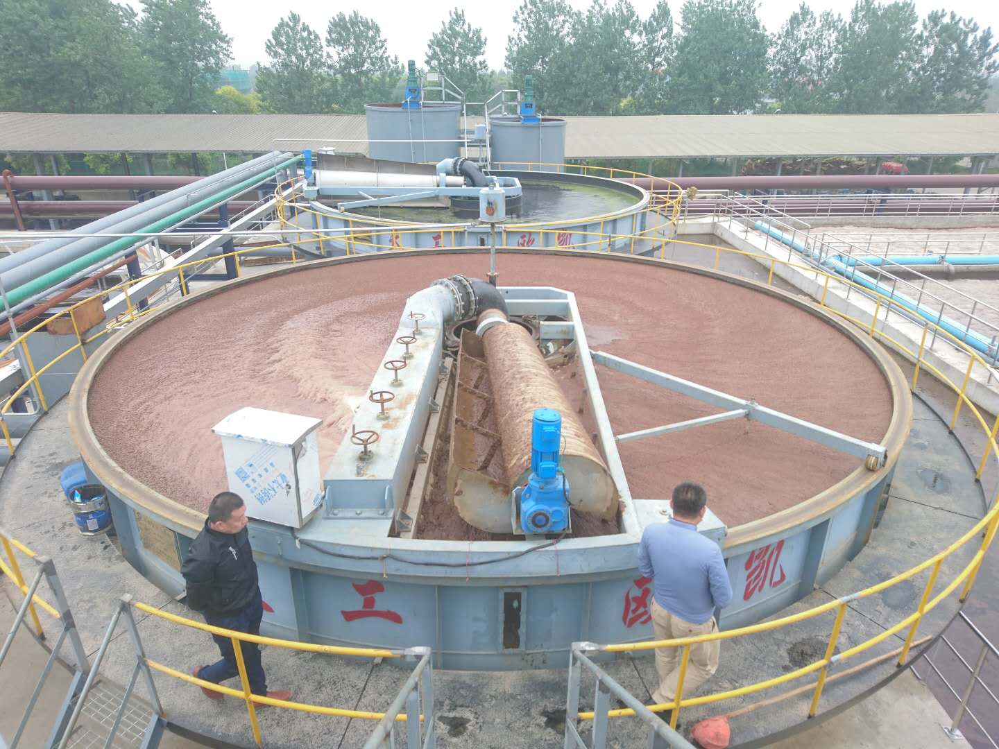 原水經(jīng)絮凝混合由池底中心管流入,水表面的浮渣用撇渣器收集起來,然后排入中央污泥槽,排入相匹配的污泥裝置,沉于池底的污泥由刮板收集至排泥槽排出,清水由中央集水機構(gòu)收集排出。凝絮好的原水是指在原水中加入絮凝藥劑PAC或PAM(PAC為400-1000mg /I,PAM為PAC的1/5左右),經(jīng)10-15分鐘的有效地絮凝反應,形成的原水。具體藥量及絮凝時間,絮凝效果須由實驗測定。